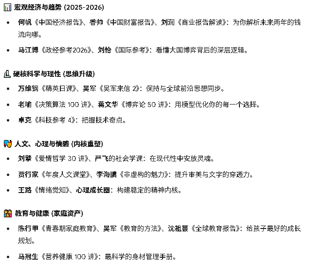 这里面有何帆和香帅教你如何在 2026 年保住财富,有万维钢和吴军帮你拆解全球智库报告,还有刘擎跟你聊透爱情和人性。这些东西,官方订一个就要几百块,全套下来过万。 > 哪怕你每天只听一讲,坚持一年,你和身边人的认知差就会像‘代沟’一样巨大。这不仅仅是资源,这是你实现阶层跨越的‘数字资产’。链接热乎,建议火速转存,给自己一个变强的机会!